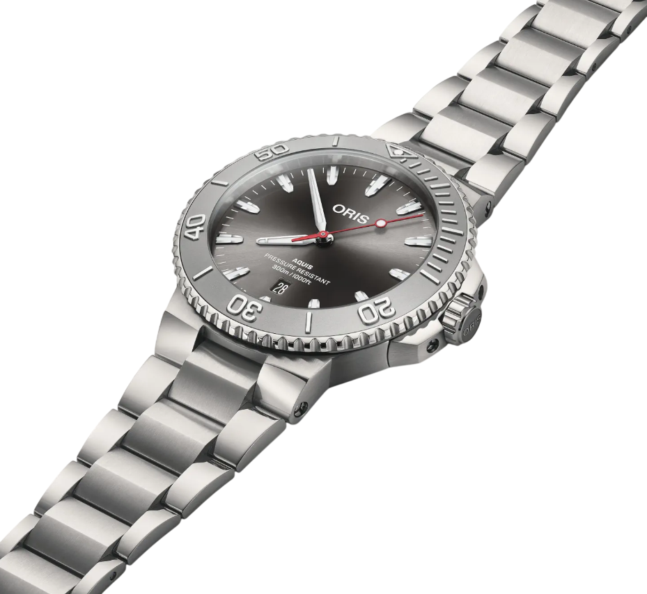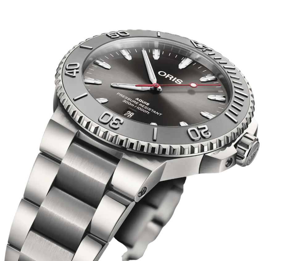 Часы швейцарского бренда Oris из коллекции Aquis Date. Корпус состоит из нержавеющей стали диаметром 43,5 мм. Циферблат покрыт сапфировым стеклом, браслет выполнен из нержавеющей стали. Окошко даты находится в положении 6 часов. Водонепроницаемость модели — 300 метров (30 АТМ). Часы поставляются в оригинальной коробке и оформлены в стильной подарочной упаковке — идеальный выбор, если Вы ищете изысканный подарок для себя или своих близких.