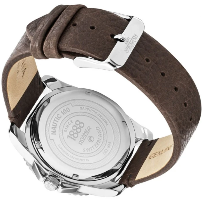 Часы швейцарского бренда Roamer из коллекции Nautic. Корпус состоит из нержавеющей стали диаметром 43 мм. Циферблат покрыт сапфировым стеклом, браслет выполнен из натуральной кожи. Окошко даты находится в положении 3 часа. Водонепроницаемость модели — 100 метров (10 АТМ). Часы поставляются в оригинальной коробке и оформлены в стильной подарочной упаковке — идеальный выбор, если Вы ищете изысканный подарок для себя или своих близких.