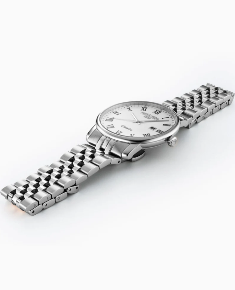 Часы швейцарского бренда Roamer из коллекции Classico. Корпус состоит из нержавеющей стали диаметром 40 мм. Циферблат покрыт сапфировым стеклом, браслет выполнен из нержавеющей стали. Окошко даты находится в положении 3 часа. Водонепроницаемость модели — 30 метров (3 АТМ). Международная гарантия на 2 года. Часы поставляются в оригинальной коробке и оформлены в стильной подарочной упаковке — идеальный выбор, если Вы ищете изысканный подарок для себя или своих близких.