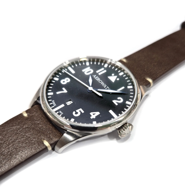 Часы швейцарского бренда Aerowatch из коллекции Les Grandes Classiques. Корпус состоит из нержавеющей стали диаметром 40 мм. Циферблат покрыт сапфировым стеклом, браслет выполнен из натуральной кожи. Водонепроницаемость модели — 50 метров (5 АТМ). Международная гарантия 2 года.