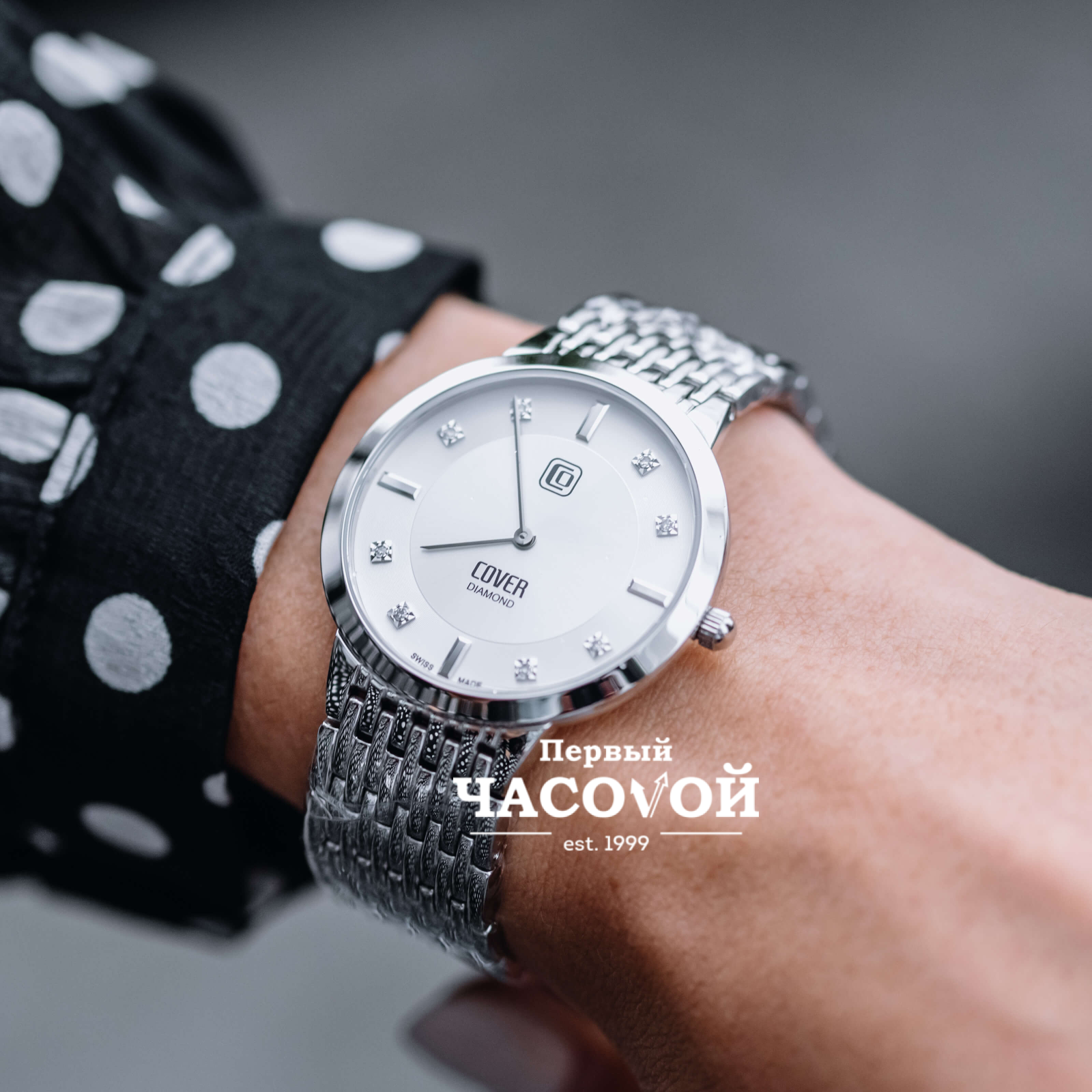 Эффектный дизайн наручных часов Cover подойдёт очень стильной особе, которая любит роскошь во всём. На белом циферблате стальные риски и восемь бриллиантов. Циферблат защищает сапфировое стекло высокого качества. Водонепроницаемость часов в 30 метров защищает часы от брызг воды и капель дождя. Браслет часов выполнен из нержавеющей стали. Эта роскошная классика будет дорого смотреться на нежном женском запястье.