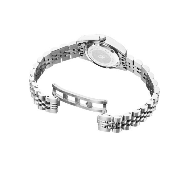 Корпус состоит из нержавеющей стали диаметром 26 мм. Циферблат покрыт минеральным стеклом, браслет выполнен из нержавеющей стали. Окошко даты находится в положении 3 часа.